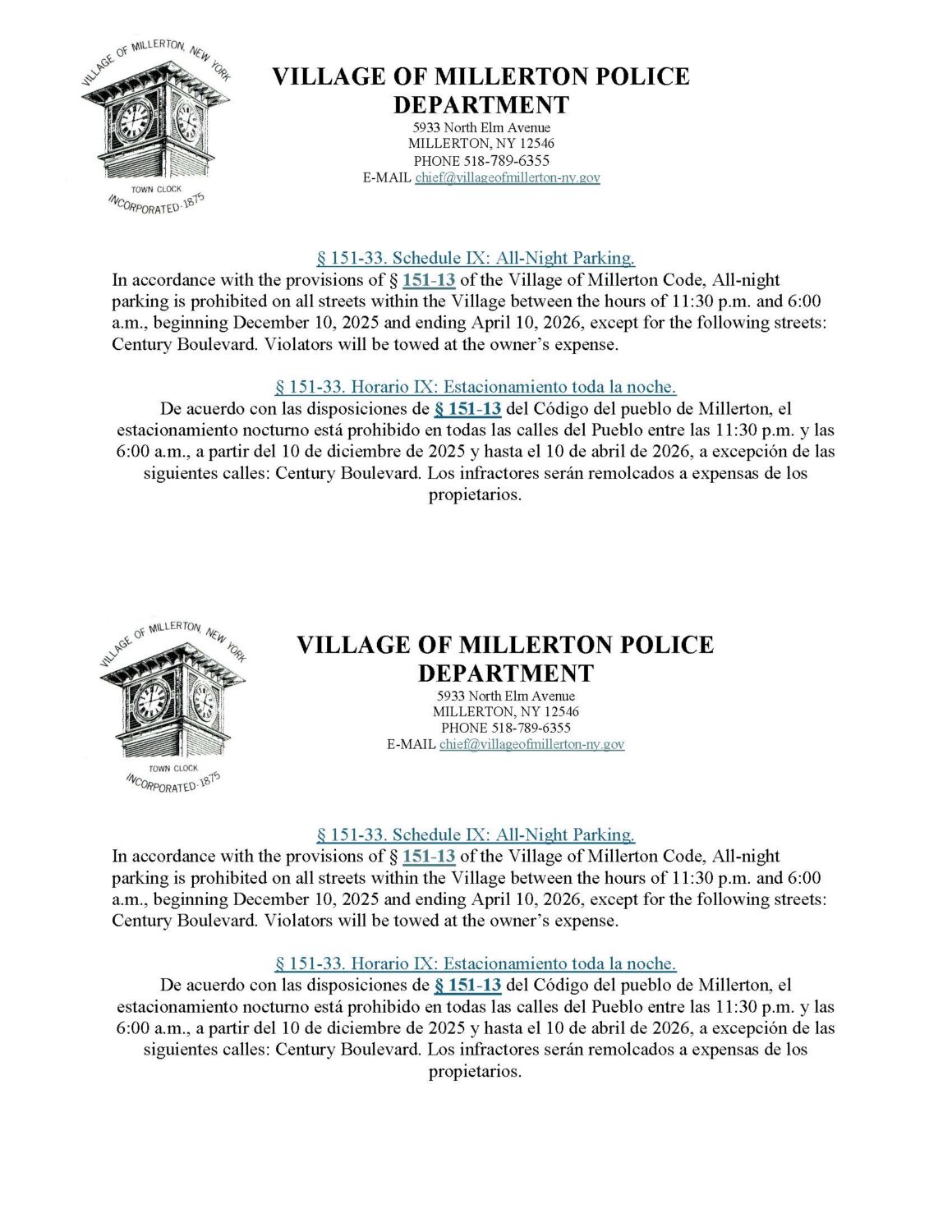 In accordance with the provisions of § 151-13 of the Village of Millerton Code, All-night parking is prohibited on all streets within the Village between the hours of 11:30 p.m. and 6:00 a.m., beginning December 10, 2025 and ending April 10, 2026, except for the following streets: Century Boulevard. Violators will be towed at the owner’s expense