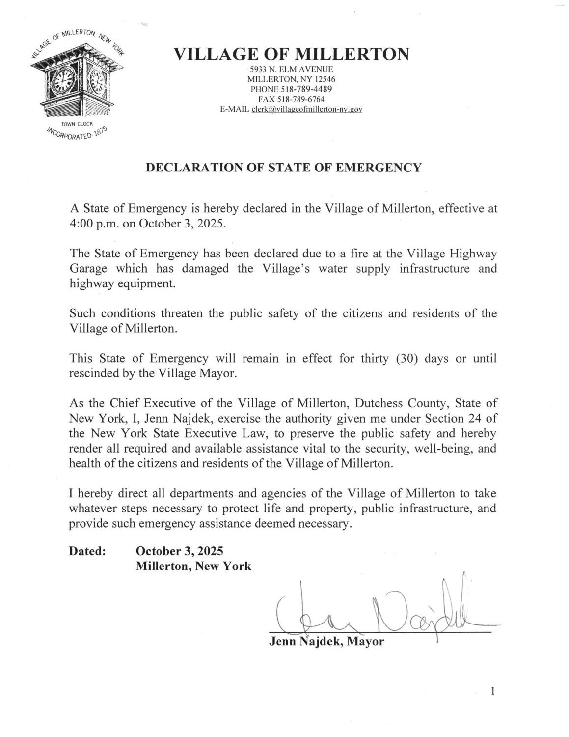 A State of Emergency is hereby declared in the Village of Millerton, effective at 4:00 p.m. on October 3, 2025.