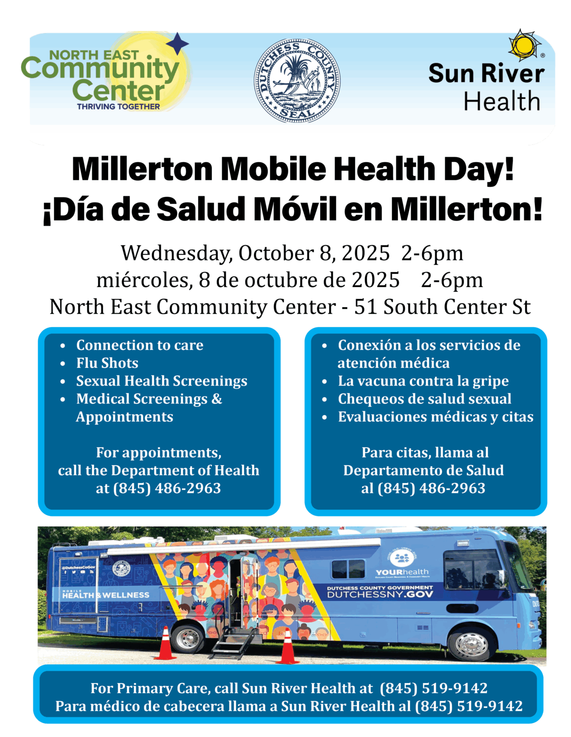 Millerton Mobile Health Day + Add to Google Calendar + iCal / Outlook export Search for: Recent Posts Dutchess County to Host Rabies Vaccine Clinic in Amenia 9:30 PM Curfew in Effect on Halloween Night 2025 Veterans Day Community Observances Dutchess County Transportation Council Declaration of State of Emergency Archives October 2025 July 2025 June 2025 April 2025 January 2025 September 2024 January 2024 December 2023 November 2023 October 2023 May 2023 December 2022 Categories Announcement Current Projects Department Meetings News Past Projects Quick Links Meta Log in Entries feed Comments feed WordPress.org