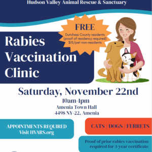Rabies Vaccine Clinic The Dutchess County Department of Health (DCDOH) is partnering with READ MORE 22 Nov 10:00 am - 1:00 pm Amenia Town Hall 4988 State Highway 22, Amenia, NY 12501